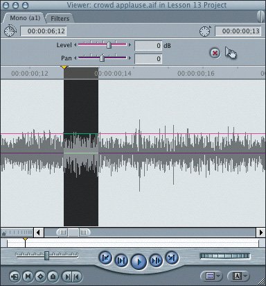 | 7. | Open the crowd applause.aif clip in the Viewer. Play the clip and listen for the sound.