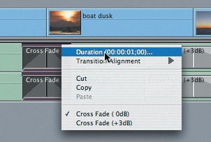 Tip Always click one side or the other of a cross fade. If you click in the middle, the edit point itself will be selected.  A small transition Duration dialog box appears with the default of 1 second. This duration is already highlighted, so you can begin typing a new duration without first clicking in the box.