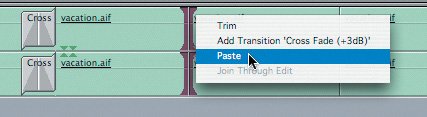 | 5. | This time, select the next edit point and press Cmd-V to paste the transition. You can also choose Edit > Paste.