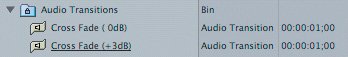 There are two audio cross fades in this bin: 0 dB and +3 dB. Notice in the Length column that each of the dissolves has a default length, or duration, of 00:00:01;00, or 1 second. The Cross Fade (+3 dB) transition is underlined because it is the default audio transition.
