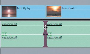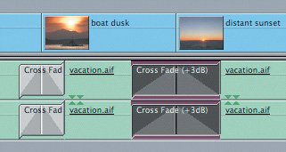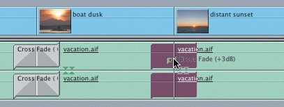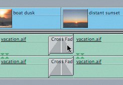 | 5. | From the Effects tab in the Browser, drag the Cross Fade (+3 dB) icon onto the audio edit point between the second and third vacation.aif clips, under the boat dusk and distant sunset video clips, and release it. Play this transition.