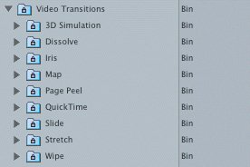 | 2. | In the Browser, click the Effects tab and close any open bins so that you see only the six primary Effects bins.