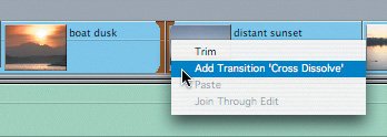 | 3. | Ctrl-click the second edit point, between the boat dusk and distant sunset clips, and choose Add Transition 'Cross Dissolve.' Play through the dissolve.