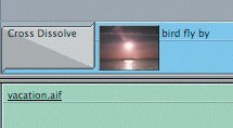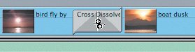 | Applying Video Dissolves The most popular type of video transition is the cross dissolve. A cross dissolve is like a cross fade in that it blends out or dissolves away from the first clip as it blends or dissolves into the second clip. The cross dissolve is the default video transition in Final Cut Express. As with audio transitions, you choose the type of video transition in either the Effects tab or Effects menu. But there are additional ways you can add a transition. 1. | Select the edit point between the bird fly by and boat dusk clips.