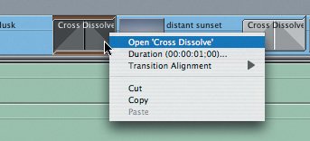 Tip To change the transition alignment, Ctrl-click the transition and choose Transition Alignment from the shortcut menu. | | | 6. | To make the first clip in the sequence fade in from black, drag the Cross Dissolve icon to the head of the clip and then release the mouse.
