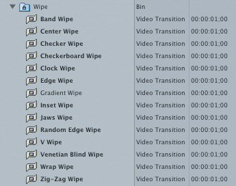 | 2. | In the Effects tab in the Browser, collapse the Dissolve bin and display the contents of the Wipe bin. Scroll down to see the complete contents of this bin.