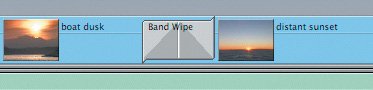 Note Depending on the processing speed of your own computer, and the current settings in the RT pop-up menu, you may see a colored render bar appear above this transition. You will learn to preview and render effects in the "Rendering Transitions" section of this lesson. | 5. | Drag the Band Wipe to the edit point between the boat dusk and distant sunset clips in the Timeline, and play it.