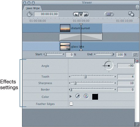 Note Wipe settings are specific to a particular wipe. But if you look at this and other wipe transitions in the Viewer, you will find that most of the settings are self-explanatory.  | 2. | In the Timeline, park the playhead in the middle of the wipe.