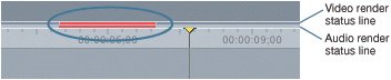 | If you are working on a computer that supports real-time effects, you will see a thin green line in the ruler area of the Timeline when you add a cross dissolve to an edit point. If your computer doesn't support real-time effects, you will see a thin red line in the same position. Remember, all transitions that can play in real time on your computer appear in bold type either in the Effects tab or Effects menu.  If you look closely at the render line above the clip, you will see that it is one of two thin lines. The upper line represents video, and the lower line, audio. If the render bar appears on the upper line, it is a message about the render status of the transition or effect applied to the video of that clip. If it appears on the lower line, it pertains to the audio. There are different colored lines that might appear in this render status area: • | Dark gray | No rendering is required. | • | Green | Transition is a real-time effect and does not need rendering. | • | Yellow | Transition can play in real time but may approximate certain attributes. | • | Orange | Will play in real time if Unlimited RT effects is selected in the Timeline RT pop-up menu, but may drop frames. | • | Red | Transition needs to be rendered to play in real time. | • | Blue | Transition or effect has been rendered. |