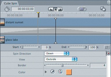 | 2. | Double-click the second transition in the current sequence, the Cube Spin, to open it in the Transition Editor. Park the playhead over this transition in the Timeline.