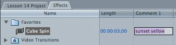 | | | 7. | Drag the Browser scroll bar right until you see the Comment 1 column. If necessary, move this column to follow the Length column. Click in the Comment 1 line of the new Cube Spin favorite transition to activate the text field, and enter sunset yellow. Press Return.