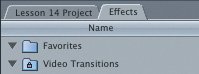 | The Effects tab in the Browser contains a bin called Favorites. This is where you save your favorite transitions. But what constitutes a favorite transition? If your favorite transition is a one-second Cross Dissolve, there's no point in making it a favorite because that's its default configuration. Use the Favorites bin for transitions you have tweaked to your liking and think you would like to use again at a later time. Once saved, these transitions can be applied to any sequence in any open project. 1. | In the Browser Effects tab, display the contents of the Favorites bin.