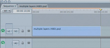 You can add filters or motion effects to graphic files, just as you would any other clip. You can even set keyframes to animate the images over time or animate individual layers of a multilayered file. Finally, when you edit this multilayered graphic file into another sequence, Final Cut Express combines the layers into one clip on one track. This way, you can trim and edit the multilayered graphic file as you would a single clip.