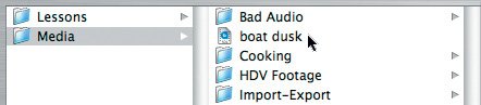 Tip You can also initiate the reconnect process by Ctrl-clicking the clip in the Browser and choosing Reconnect Media from the shortcut menu or by selecting a clip in the Timeline and choosing File > Reconnect Media. | Project Tasks You now have several clips in your project that you can use to build a sequence about vacations. Take a moment to organize your project elements. 1. | Hide Final Cut Express and then put the boat dusk clip back in its original folder, FCE HD Book Files > Media > Scenic Beauty.