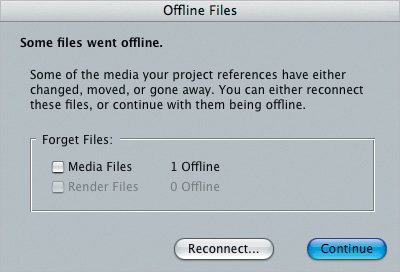The Offline Files dialog box appears, indicating "Some files went offline." You can forget the movie (or render) file so that Final Cut Express doesn't look for it again. Or you can reconnect to where the file is currently located. Clicking Continue will postpone the decision. The file will remain disconnected, and Final Cut Express will display the Offline Files dialog box the next time you open the project.