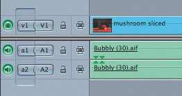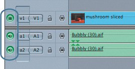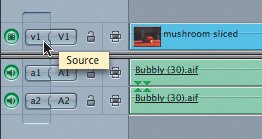 | In the Timeline, video and audio clips sit on horizontal tracks, which are linear representations of time. Time proceeds from left to right in the Timeline. The blue clips on top represent video, and the green clips below represent audio. To the left of the very first clips are track options and controls used during the editing process.  In Final Cut Express, you can work with multiple tracks. You can have up to 99 separate video tracks and up to 99 separate audio tracks. You might wonder why you need more than one video track and a couple of audio tracks since you can only see one thing at a time and hear one stereo sound track. Think about this. What if you wanted to place a title over your original source material? You would need two tracks, one for the source material and one for the title. And if you wanted to create a complex opening sequence that involved four different images moving about on your screen at the same time, each of the four clips would require its own track in the Timeline. Think how many tracks they must use when editing the opening to any James Bond movie! In later lessons, you will add tracks for titles and motion effects. For now, you will work with one video track and two audio tracks. Patching Source Tracks Each track in the Timeline is given a level ID number, such as Video 1, or V1, and Audio 1 and Audio 2, or A1 and A2. As you begin to edit with more tracks, you will want to make sure you are placing your source clip on the right track level. The way to do this is to connect or patch a source audio or video track to a specific destination track. In many cases, this is done for you automatically when you open a clip. This is discussed more in Lesson 5. The source and destination tracks appear in the Timeline track control area, with the source controls to the left of the destination tracks. The destination tracks are stationary and represent the tracks you see in the Timeline. The source tracks are indicated by a lowercase v for video and a for audio, while the destination tracks are indicated by an uppercase V or A. A DV audio/video clip has one video source track and two audio source tracks when there is stereo audio. 1. | Move the pointer over the v1 source control in the Timeline track area.