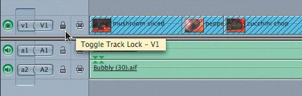 | Locking Tracks Sometimes, you may need to make changes to some of the tracks in your Timeline without affecting any of the other tracks. To do this, you lock the tracks you do not want to affect. 1. | On the V1 track, click the lock next to the track number. This is the Track Lock control.