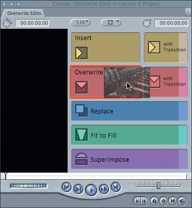 Note If the Overwrite section is highlighted in the overlay, you can drop the clip anywhere in the Canvas image area to make an Overwrite edit. | Using the Keyboard Shortcut You can also use a keyboard shortcut to make an Overwrite edit. This produces the same result as dragging to the overlay in the Canvas. The keyboard shortcut for Overwrite edit is F10. You will place the next edit at the end of the last one. Tip The Exposé function in Tiger (OS 10.4) uses the F10, F11, and F12 keys to change window layout on the Desktop. To use these keys for Final Cut Express editing functions, open your System Preferences window and select Dashboard and Exposé. Change the keyboard shortcuts from F10, F11, and F12, to F1, F2, and F3. 1. | Open the ab roller clip in the Viewer.