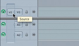 After opening a clip in the Viewer, any audio or video source tracks are represented by source controls in the Timeline track area. Since the V1 track is the only video destination track in the Timeline, the v1 source track is automatcially patched to that track.