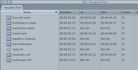 Tip If you do not want to use all of the clips in a bin for your storyboard, copy the clips you want to use and paste them into a new bin, and work with that bin of clips. Copying and pasting icons like this doesn't make new copies of your media, just new links to the media files. | 4. | With the Browser in list view, look at the In and Out columns next to the Duration column of the Vacation Fun clips. No edit points have been set.