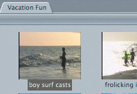 Note When you scrub through a thumbnail clip, you can scrub through the full length of the clip, whether or not there are any edit points attached to the clip. | Changing a Thumbnail Image When you capture media from your original source tapes, you often begin a few seconds before a specific action begins. This extra footage gives you additional material or handles for adding dissolves or fade-ups in the editing process. It also ensures that the start of action is clear and complete. In a thumbnail image, a clip is always represented by the image of the first captured frame. This is called the poster frame because it represents a clip visually the way a poster represents a movie. But sometimes the poster frame of the captured clip is not a good indicator of the action that follows. For example, you may have a clip of someone skating. But because you included a few seconds of scenery at the head of the clip before the action begins, you don't see the skater in the thumbnail image. There are several ways a clip's poster frame can be changed so that you can better identify the content of the clip. 1. | With the Scrub tool, scrub through the boy surf casts clip until you see the boy, but don't release the mouse. This is the frame you will use to represent this clip.