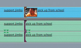 | In the pick up from school clip, Jim says, "Uhhh," before he begins speaking. Let's apply some keyboard shortcuts to trim away the "Uhhh." | | 4. | With the Ripple tool, click the In point of the pick up from school clip to select it.