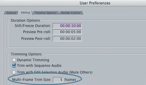 Tip You can also press Shift-] to trim a default number of frames, such as 5, 10, or 20. To change this number, press Option-Q to open the User Preferences window and enter the desired Multi-Frame Trim Size on the Editing tab.  | 6. | Press Shift-] a few times to get closer to where Jim speaks.