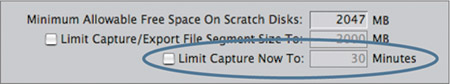 NOTE If you are capturing HDV footage, the sync between the audio and video may appear to be off. This is only how it appears during the capture process. It will capture in sync. | 6. | To automatically limit the amount of time you can capture in one stretch, click the Capture Settings tab and then the Scratch Disks button.