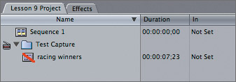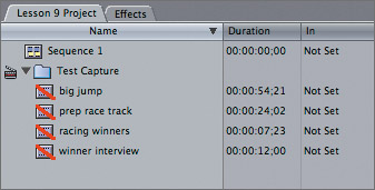 NOTE If your list contains footage from another reel or tape, Final Cut Pro will prompt you to change reels and continue. When Batch Capture is completed, each of the selected clips in the logging bin will have footage connected to them, and the red lines will be gone.