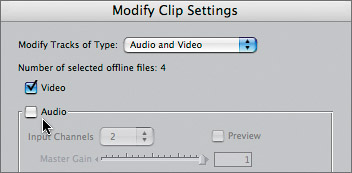 Using the Modify Clip Settings dialog is an easy way to change the settings of one or more clips before you capture. For example, if you logged a clip or group of clips as audio and video, but now realize you want to capture them as video-only clips, you can uncheck the Audio box to make the change. Or, you could toggle from mono channels to a stereo pair.