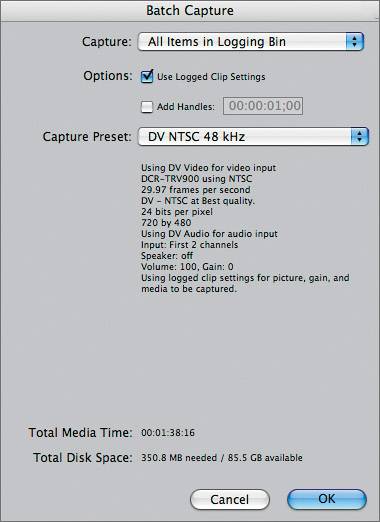 NOTE If you placed all of your clips in a separate bin window, you can select them all by pressing Cmd-A, or by choosing Edit > Select All. | 7. | Click the Capture Batch button in the Log And Capture window.