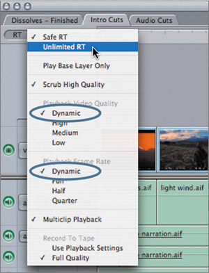 | Cross dissolves can have a smoothing effect on a sequence, but other transitions can jazz it up. The more complex a transition is, the more parameters you can adjust in the Transition Editor. Most of these transition effects can be played in real time; some may have to be rendered, which you will learn to do in the next exercise. TIP To make sure you see as many real-time effects as possible, click the RT pop-up in the Timeline and choose Unlimited RT from the shortcut menu. Click the RT pop-up again, and make sure Dynamic is checked in both places it appears. You will learn more about these options in the next exercise.  1. | Close all the sequences that are open in the Timeline. In the Browser, open both the Racing Cuts and the Racing Transitions sequences. Click between the two tabs, and play the Racing Transitions version.