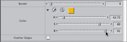 TIP To search or preview different border colors before selecting one, select the eyedropper, and click and drag around the Canvas image area without releasing the mouse. The border and color tile will reflect whatever color the eyedropper picks up. When you see the color you want, release the mouse. The color tile in the Color parameters has changed to the color you picked. Once you've selected a color, you can adjust it and save it to use for other borders in other effects.