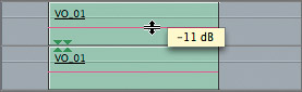 TIP As you drag, the volume level overlay will change in different increments depending on the height of the track. To see each increment and have greater control, hold down the Command key as you drag. Determining a starting point is the first step in setting levels. When you preview the sequence audio with this clip, you may need to come back and readjust these narration clips.