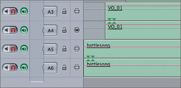 | 6. | Now click the Solo controls for the A5 and A6 music tracks to add them to the mix. Play the areas where the music and narration clips overlap in the sequence.