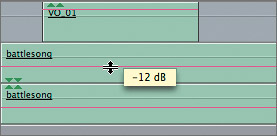 | 7. | Drag the volume level line on one of the stereo music tracks down 12 dB, and play the area again. Adjust the level so the music is clearly heard but not distracting to the narration.