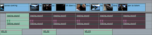 | 9. | Play the sequence where the first narration clip, VO_01, overlaps with the first rowing sound clip. Lower the first rowing sound volume to a mix level you like.