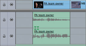 TIP When viewing the waveform display on stereo audio clips, such as in this sequence, you can enlarge one track but make the other small, since whatever you do to one track of a stereo pair, you do to the other simultaneously. | 12. | Press Shift-Delete to delete the pause and pull up the remaining portion of the clip. Play the new edit point to see how it sounds.