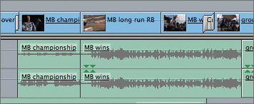 | 8. | In the Timeline button bar, click the Linked Selection button to toggle it off. Drag the In point of the MB wins clip to the left, and snap it to the Out point of the MB championship clip. Play from this location.