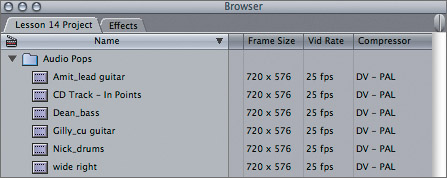 | 3. | In the Browser, display the contents of the Audio Pops bin. Drag the scroll bar to the right until you see the Frame Size, Vid Rate, and Compressor column headings.