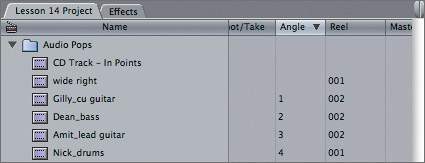 NOTE It is not required that a clip have an angle number before you include it in a multiclip, but it can be a helpful step, especially in organizing a large project. | 8. | Click in the Angle column for the Gilly_cu guitar clip, and enter 1. Enter 2 for the Dean_bass clip, 3 for the Amit_lead clip, and 4 for the Nick_drums clip. Click the Angle column head to sort by angle number.