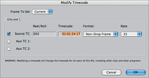 | 2. | In the Modify Timecode window, click the Frame To Set pop-up and choose either Current or First.