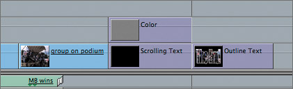TIP With a little concentration, you can still use the Shift key in this step to ensure you are positioning the copied clip directly above the original. The trick is this: don't release the Shift key before releasing the mouse.  In the Canvas, you still see only a single gray bar because the four Color clips are currently stacked on top of each other.