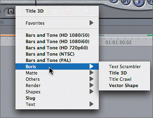 | There is another category of text generators called Boris in the Generator pop-up menu. (In Final Cut Pro 4 and HD, this option was referred to as Title 3D.) Boris contains an advanced set of text generators that provide great flexibility and high-quality output. The Boris submenu lists four text generators. Unlike the previous text options covered in this lesson, these access a separate window, offering a wider variety of parameters, including 3D control of individual characters (Title 3D). The Boris text options allow you to make a number of style choices and then save them as part of a style palette you can then apply to other clips in other projects.  The Boris Text Scrambler option allows you to create an animation in which your text letters scramble and then slowly resolve to the correct text. In this exercise, to sample a Boris effect, you will edit the Text Scrambler text effect over the MB long run clip toward the end of the sequence. 1. | Move the Playhead to the middle of the MB long run clip, and target the V1 track.