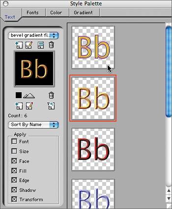 | 7. | From the upper pop-up menu in the Style Palette, choose bevel gradient fill. B2D, and double-click the second sample when it appears in the pane to the right.