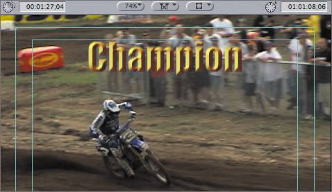 | 10. | Place the playhead at the end of the MB long ride clip, and press Shift-left arrow three times to park the playhead 3 seconds before the end of the clip. Double-click to make sure that the Champion text is in the Viewer. In the Controls tab in the Viewer, click a Keyframe button for Scramble Characters and for Opacity.