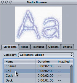 | 3. | Select the Coil LiveFont, and watch the preview at the top of the Media Browser change to reflect the current selection.
