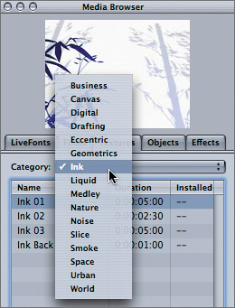 | 9. | In the Objects tab, choose Particles from the Category pop-up menu. Click a few objects in the Name column to preview them.