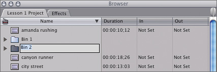 | The key to organizing a Final Cut Pro project is to sort clips and elements into bins, just as you would organize computer documents by placing them in folders. You can also place bins within bins, just as you would place folders within folders. Organizing your material into bins will streamline your editing process, making it easier to find and access project elements. Creating and Naming Bins The first step to organizing your project is to create new bins to sort your elements. You will create three new bins to organize the current project, one each for clips, audio, and sequences. Typically with Final Cut Pro, you can accomplish the same task several ways. You will create three bins using three different methods. 1. | Click in the Browser window to make it active.