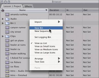| 7. | To create the third bin, Ctrl-click the Browser gray area under the Name column and choose New Bin from the shortcut menu. You can also right-click using a two-button mouse.
